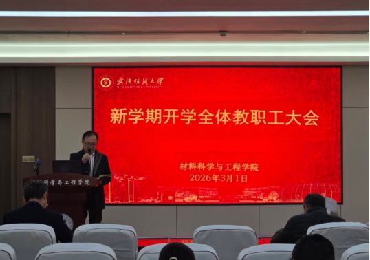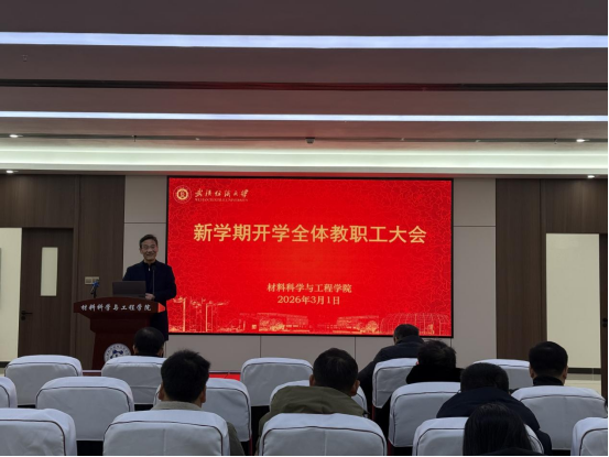 为统筹推进新学期各项工作有序开展,明确工作重点、压实工作责任,2026年3月1日上午,材料学院召开2026年春季学期全体教职工大会。学院班子成员、全体教职工参会,会议由学院党委书记王罗新主持。会议部署开学重点工作、传达学校会议精神、提出发展要求与工作底线,为新学期工作开展指明方向。
