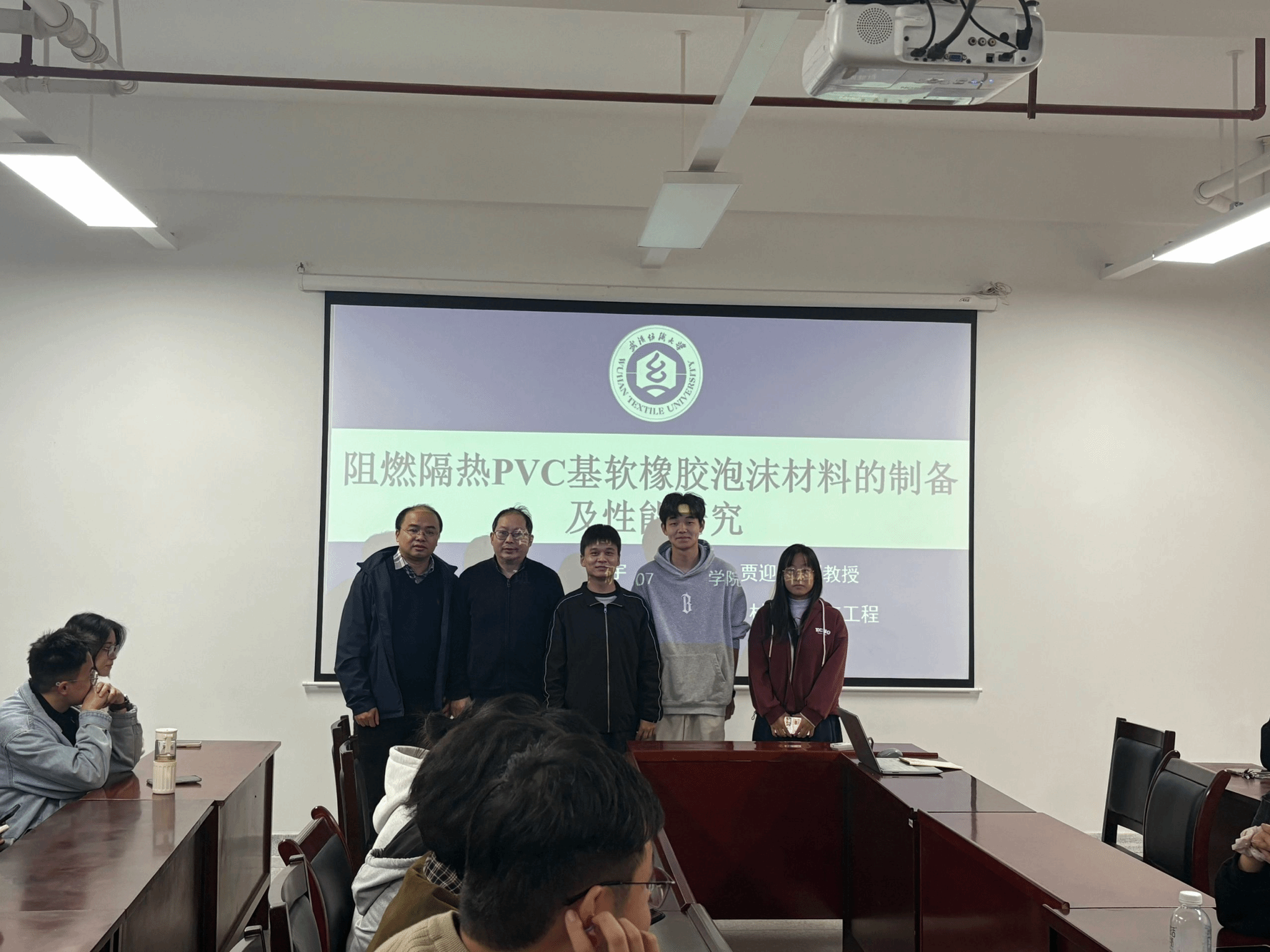 高飞宇同学以《阻燃隔热PVC基软橡胶泡沫材料的制备及性能研究》为题,针对传统PVC泡沫溴-锑阻燃体系高毒、高污染问题,创新引入硼酸锌/三氧化钼协效体系,构建“玻璃化炭层”阻燃机制。实验结果表明,当ZnB/MoO₃ = 6:4时,PVC泡沫极限氧指数提升至36.5 %,烟密度降低52 %,热释放速率峰值下降51 %,V-0级阻燃,且力学性能保持率>90 %。在提升阻燃PVC泡沫防火性能和安全性环保性领域具有重要应用价值。