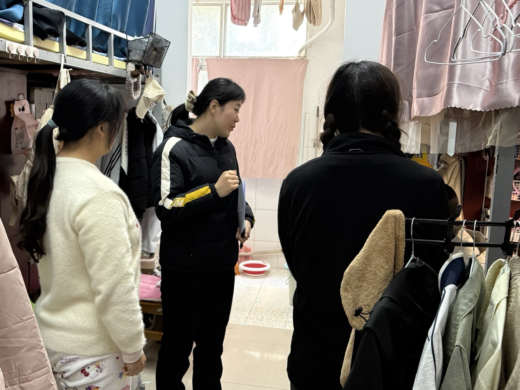 在寝室卫生检查中,重点查看宿舍整体环境卫生、物品摆放、通风保洁情况,对内务整洁、布局规范的宿舍提出表扬,鼓励同学们保持良好的生活习惯;对存在卫生死角、物品杂乱的宿舍,现场指导学生进行整理,引导大家树立“宿舍是我家,整洁靠大家”的理念,共同维护干净舒适的生活空间,打造文明和谐的宿舍氛围。